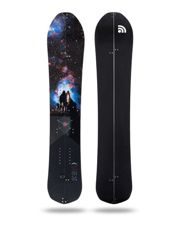 Backcountry brilliance is now built to split. An essential tool for guides and those that like to venture out of bounds, this board is built to break into trek skis. Unclip the board and revolve the bindings into touring mode, you can hike out and up the mountain side.